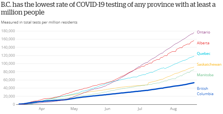 There have been numerous concerns raised by individuals that BC has very low COVID-19 testing numbers. And it’s true, BC has done less testing than any comparable province in Canada. This is in part due to restrictions placed on who can be tested, and under what conditions.