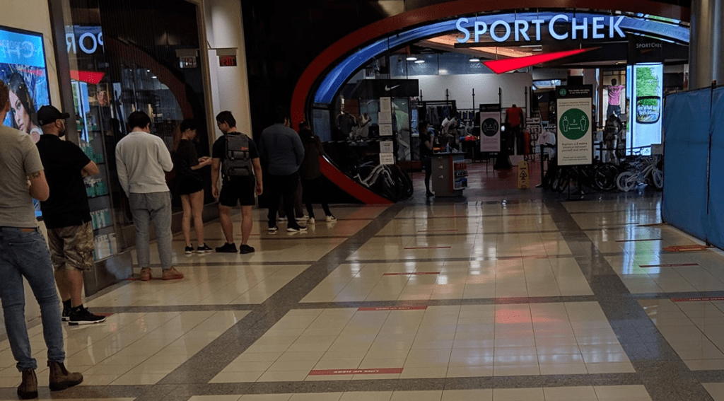 Today I went shopping for more supplies at Metropolis. Many stores in the mall remain closed, but some have re-opened with strict rules on how many can be in the store at once. Distanced lineups outside doors can be seen here and there.