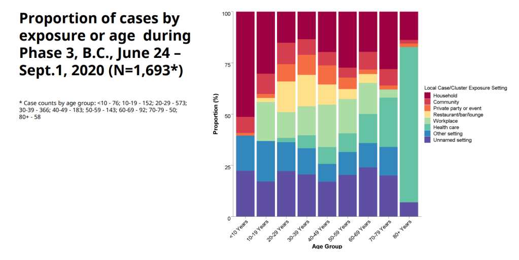 Based on the above chart we can see that over the course of a little over a week there were approximately 172 transmissions of COVID-19 specifically linked back to restaurants, bars, and lounges. These are the specific cases being targeted with today’s new restrictions. Keeping in mind that in many cases these transmissions can lead to the “household transmissions” shown in red in the chart above as well.