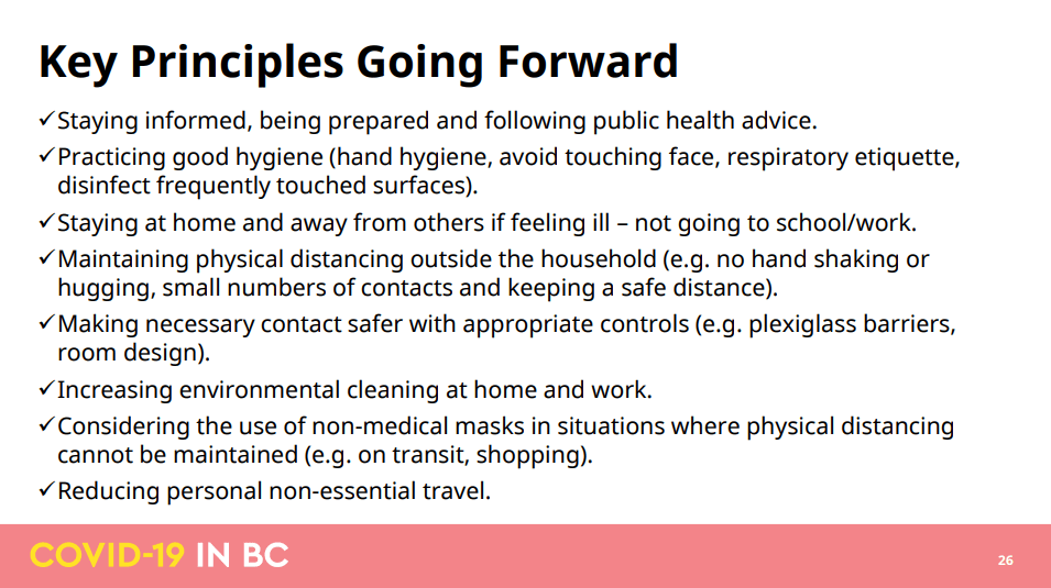 (Before I continue, I need to express that here in BC we have a series of guidelines that are meant to work in tandem (shown in the below graphic) and not just the single 2m distancing rule. We also have rules about hygiene and respiratory etiquette which will greatly minimize the dispersal of offending droplets. So using an unimpeded cough or sneeze to show that 2m distancing is insufficient isn’t as ruinous for our guidelines as it may immediately seem. Similarly, BC has supported the belief that COVID-19 could spread via aerosols under specific conditions even as far back as February, and while we have learned more in this regard since then, it is still not believed to be the main source of transmission.)