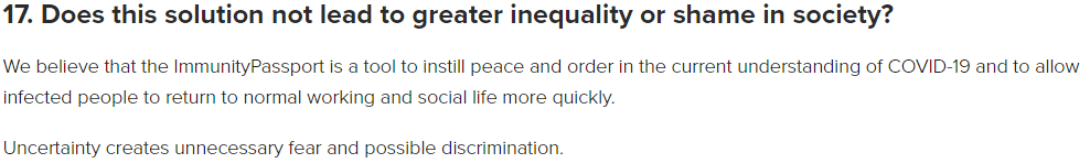 - Unfair access; In countries with high barriers to medical services, like the USA, people who can not afford the testing costs will be unable to obtain an immunity passport.