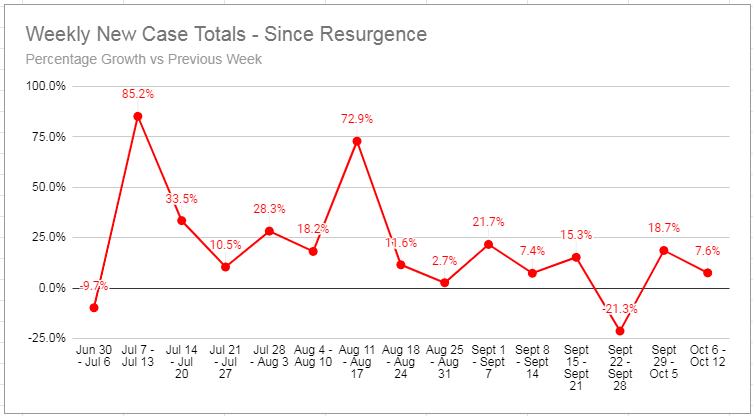 Yesterday was a holiday, so ‘weekly chart day’ was pushed to today! As you can see from the above chart, our weekly totals continue to climb. In fact, this week’s total is the highest weekly total since the beginning of the pandemic. Not just that, but Saturday, October 10th’s new infection number was also a record at 170 cases. Dr. Bonnie Henry mentioned in her address today that over the weekend 6000 additional tests were processed that had been part of a previous backlog, which may account for Saturday and Sunday’s (159) higher than average new case numbers.