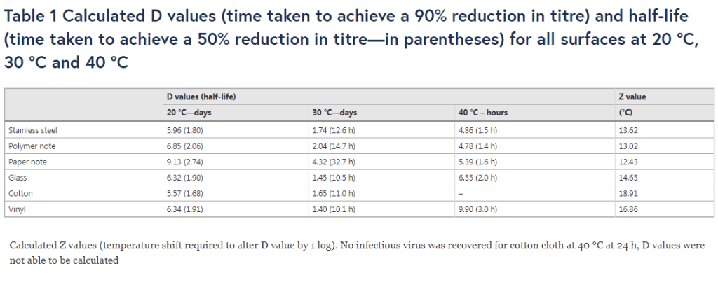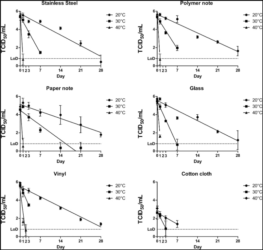 The above data shows that in almost ideal conditions, the virus can be kept alive and recoverable for up to 28 days on some materials. To achieve this, relative humidity must be kept no higher than at 50%, there must be no light or UV radiation of any kind, there must be no agitation or friction of any kind against the sample, and heating must be kept at a consistent 20C (room temperature). Raising the heat (as seen on the above chart) or the relative humidity, or allowing contact with light or even fingertips could quickly cause the lifespan of the virus to drop.