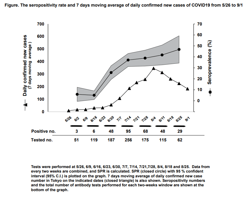 A pre-print study on the seroprevalence of COVID-19 antibodies in Tokyo is turning more than a few heads since its late September release. The study followed 615 outwardly healthy volunteers across 11 locations, all employed by the same company, 350 of whom submitted to 2 tests each with about a month between them. For the group that submitted to 2 tests, during the time between them, 21.4% of people who initially tested negative for COVID-19 antibodies later tested positive for them. The overall group saw their seropositivity rate jump from 5.8% to 46.8% over the Summer.