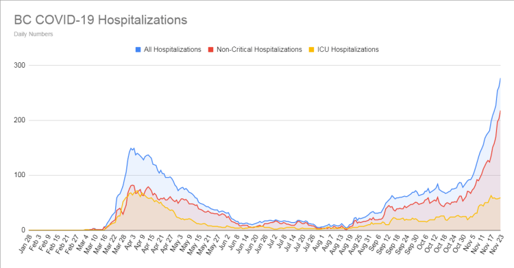 In the last month, our hospitalization numbers have begun to spike into potentially dangerous territory. We also know from Health Minister Adrian Dix’s recent hospital beds report that many health authorities are close to reaching their initial base bed limits. However, there are still surge beds that can be utilized, and also emergency beds in make-shift hospital spaces that can also be called upon.