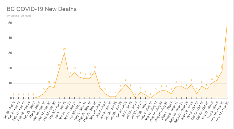 Every Monday we take a look at our week to week totals and chart how BC’s fight against COVID-19 is progressing. Because of the reporting schedule used in BC, we use 7-day totals running from Tuesday to Monday. The above chart shows each week of the pandemic as a unique bar. As you can see above, our numbers are still trending upwards, despite the new restrictions put in place a little over 2 weeks ago.