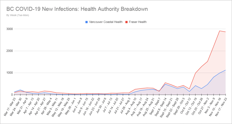 Starting this week we are now adding health authority breakdown charts of the weekly totals. As you can see from the above graphs, Fraser Health continues to report the lion’s share of new cases, but for the first time since early October, the numbers took a small turn downwards.