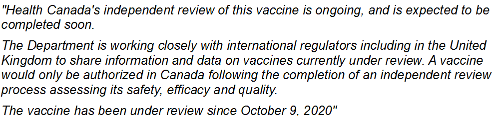 Of course, Pfizer is not the only vaccine candidate that has been submitted for emergency use approval. So far Health Canada reports 4 possible vaccines that are currently under consideration: