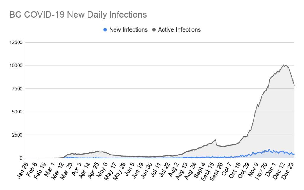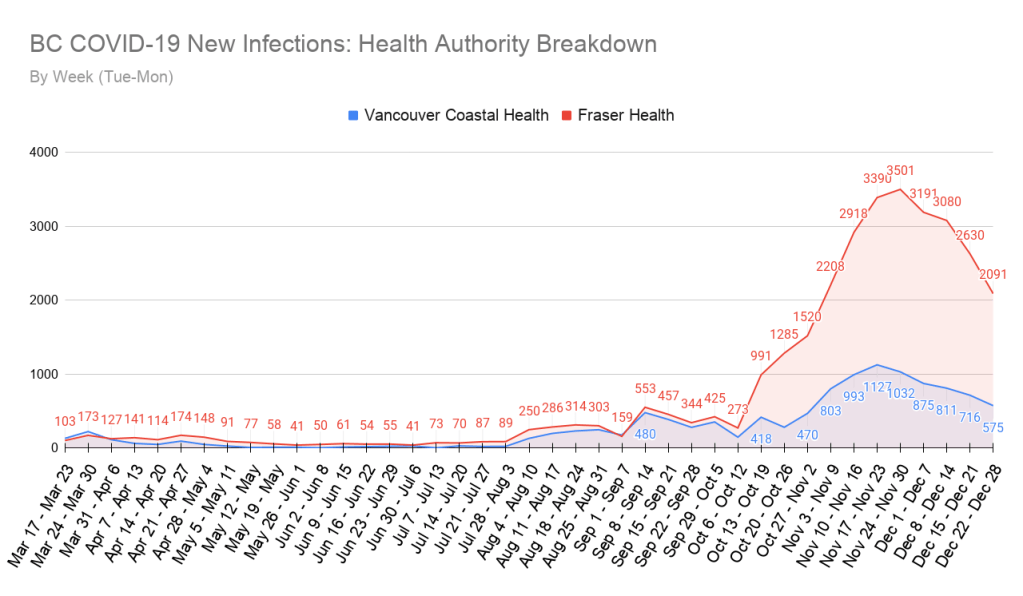We continue to see negative growth rates on our week-to-week comparison chart. Looking exclusively at the above data would give us a very positive impression of our current new case numbers. But in her live briefing this afternoon, Dr. Bonnie Henry mentioned that over the last week or so, testing numbers had taken a steep dive, giving her reason for concern that people may have been avoiding getting tested before Christmas celebrations.