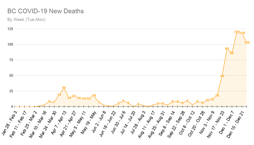 In the last 7-days, another 103 people in BC have died from COVID-19. This is a significant drop from the previous 2 weeks but still remains at disturbing and unacceptable heights. Hopefully between our new case numbers continuing to drop, and vaccinations of the most at-risk being ramped up further, we can get this number down as low as possible, very quickly!