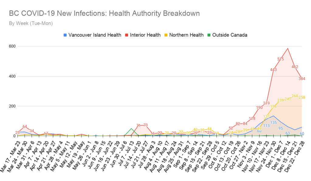 Unfortunately, we see that the Vancouver Island Health region has begun to see an increase in new case numbers again. This is also the area where the highly contagious B.1.1.7 variant has been found in BC, but hopefully, these two facts are unrelated.