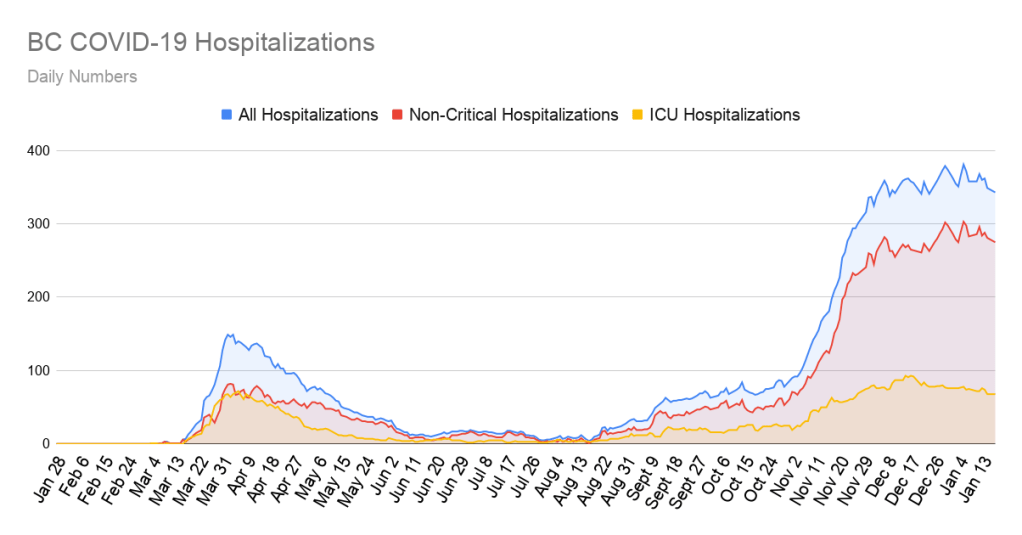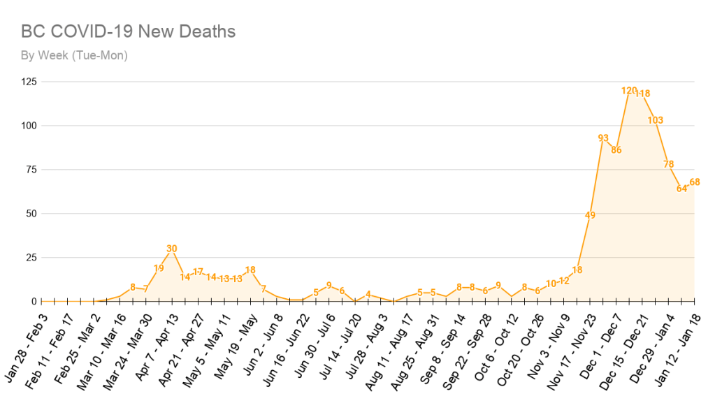 In the last 7 days, another 68 people in BC have died from COVID-19, 4 more than died in the previous 7-day total. Before this increase, there had been 4 straight weeks of declines in 7-day death totals. But as our new case numbers drop, and the number of hospitalizations also drop, we should see this number begin to decline again soon. As always, our hearts go out to all those who have lost their lives to COVID-19, and those left grieving for them.