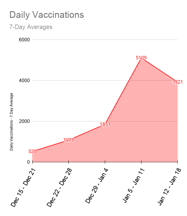 This week starts with some good news! It seems that our “Holidays Bump” only lasted a couple weeks, and we are now seeing roughly the same 7-day new case totals as we did before Christmas. Between the last 2 7-day periods, there is a difference of 566 cases, which is a significant improvement.
