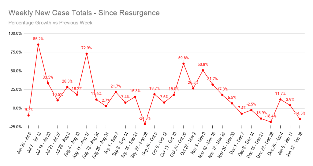 This graph tracks the growth rate between 7-day totals and is a good indicator of the overall momentum of new case numbers.