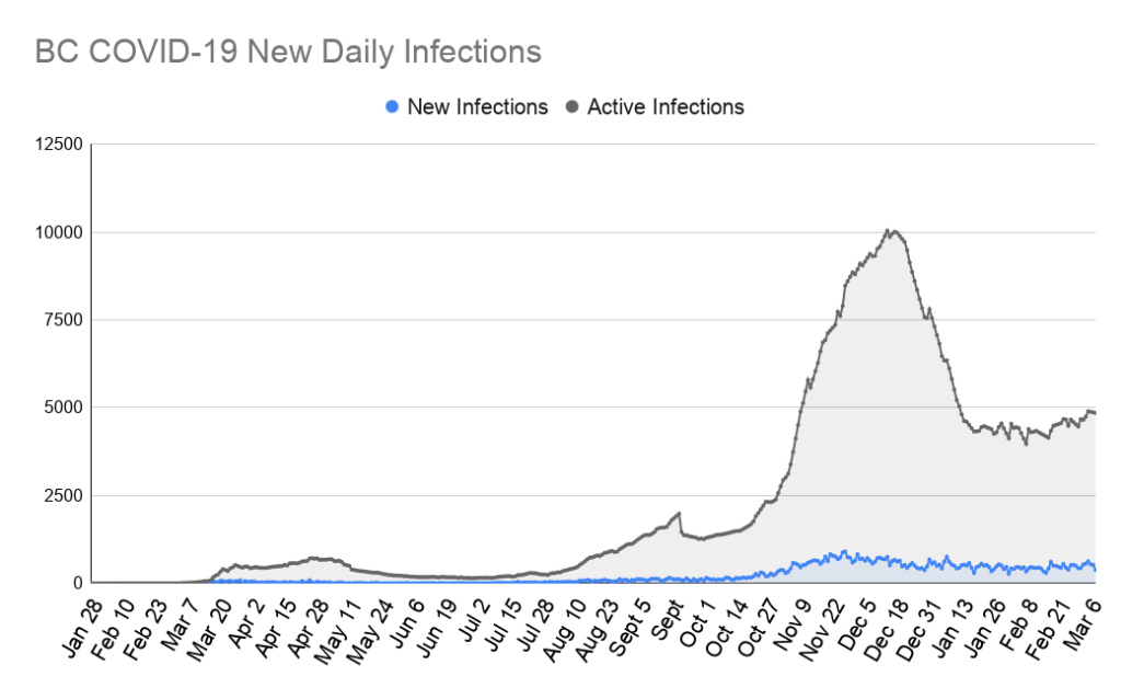 In the last 7 days, another 28 people in BC have died from COVID-19, which is the same number we saw last week and the week before. It’s very unusual to see this number plateau in this way for 3 weeks! We continue to hope that with more and more vaccinations going in order of those who are most at risk, that this number will start falling again soon! As always our hearts are with everyone who has lost a friend or loved one to this virus.