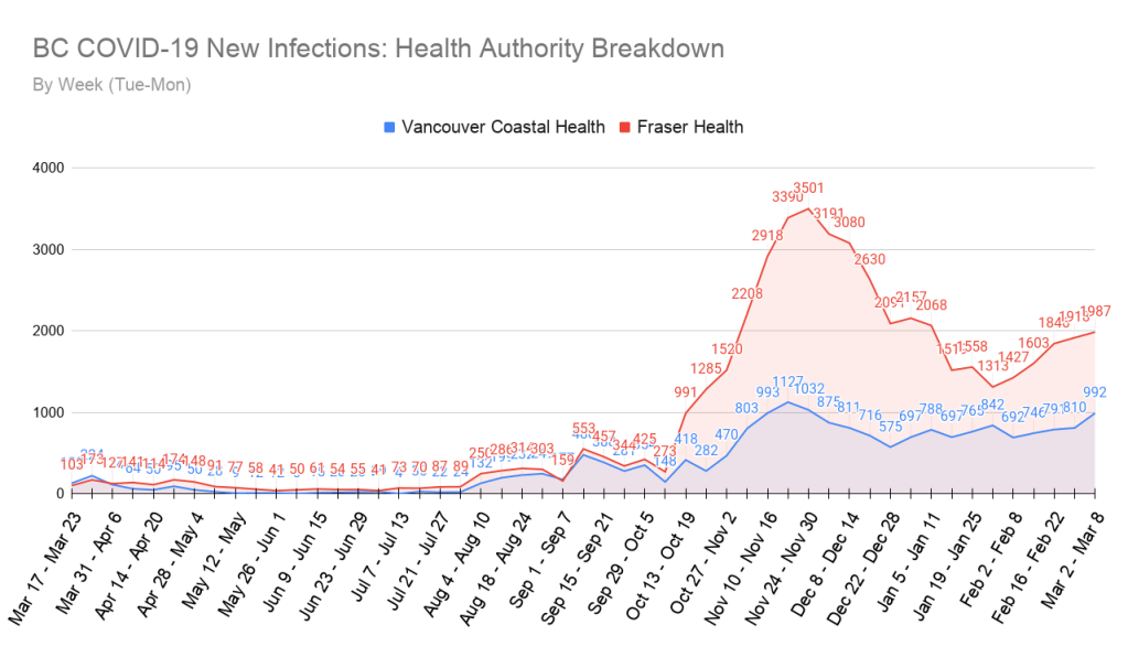 The Fraser Health region has now seen 5 straight weeks of new case number growth, week to week. The record for consecutive weeks of new case number growth currently sits at 7, from back last year in October and November. By comparison, the Vancouver Coastal Health region is currently at 4 straight weeks of week-to-week new case number growth, which also ties its current record.