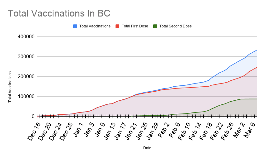 BC Public Health is expecting to be able to get all BC residents at least their first vaccine dose by July 2021. To help accomplish this, the second dose of vaccine has been pushed back from 6 weeks later, to 16 weeks later. More information about the vaccine roll-out plan can be found here. This week Canada is expecting to receive about 900k doses of different approved vaccines. By the end of March Canada expects to receive 8 million doses of vaccine.