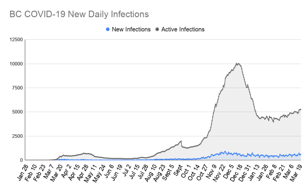 There are currently 5290 known active cases of COVID-19 in BC. This number represents an increase of about 300 active cases from this time last week. The number of active cases has been on a slow steady increase for several weeks now and currently sits at the highest number we’ve seen since January 10 this year.