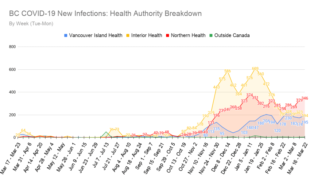 It’s hard to tell due to lines overlapping in some areas, but the Vancouver Island Health region just barely overtook the Interior Health region for new cases reported in the previous 7 days. The Interior Health region is also the only health region to report a decrease in new cases in the past week.