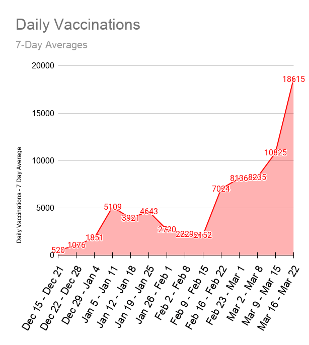 The above chart shows the average number of vaccinations for each 7-day period since the beginning of the vaccination program. As you can see in the last 7 days the daily average number of vaccinations has jumped massively, nearly doubling the previous week’s average! To put this into perspective, it means that almost 1/3rd of all the shots given out over the entire vaccination program were given out in the last 7 days. Referring to this as a “new record” would be under-selling the achievement.