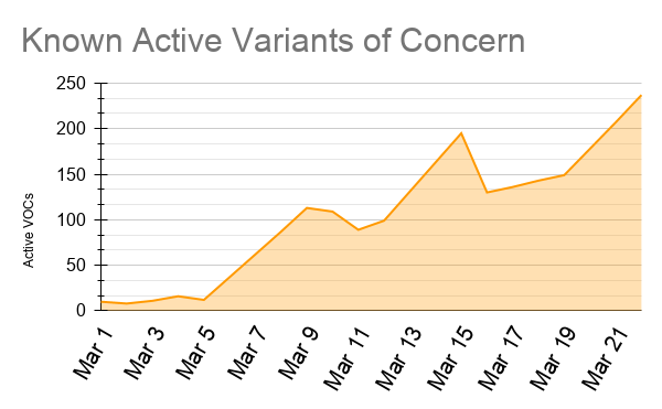 Unfortunately, today we also learned of another significant jump in active cases of COVID-19 Variants of Concern (VOCs). As of today, there are 237 known active cases of different COVID-19 VOCs. Most of these are known to be B.1.1.7, but a growing number are also the P.1 variety.