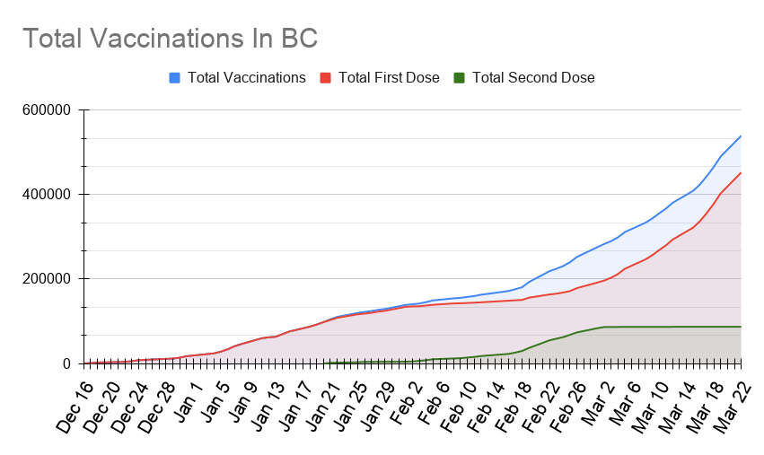 Since the beginning of our vaccination program on December 15th, there have been a combined 539,408 COVID-19 vaccinations in our province, with 87,161 of these being a person’s second dose. As you can see from the above graph, second doses have completely flattened out now that the province is waiting 16 weeks between them.