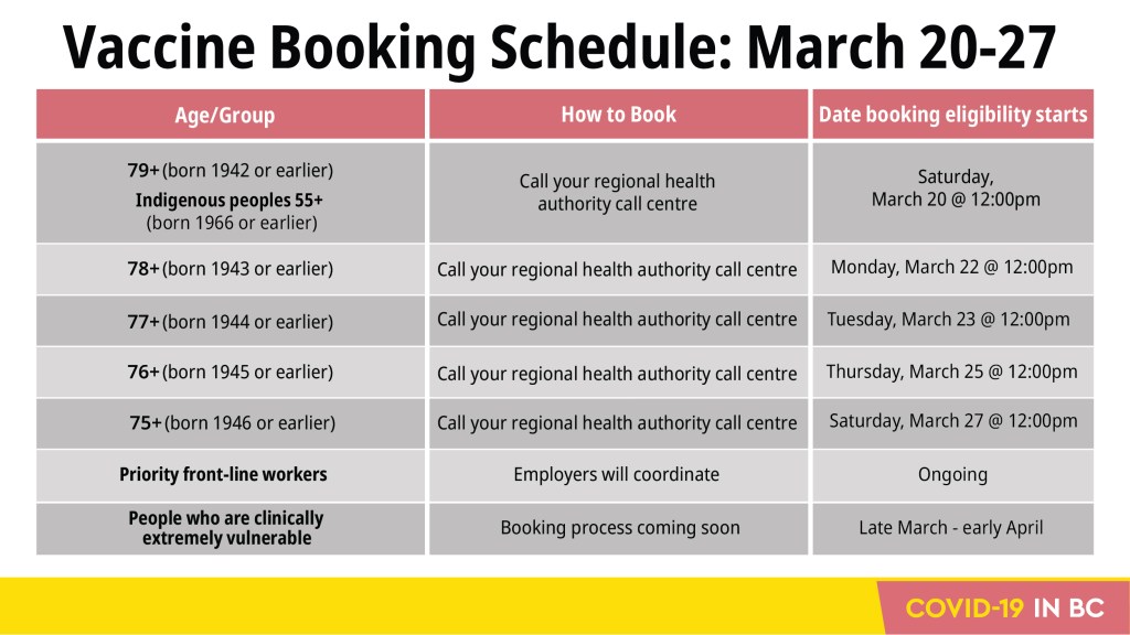 With the start of this week, we have now entered Phase III of BC’s Immunization Plan (sort of). Vaccinations are still on-going for people over the age of 80, but booking is now starting to occur for those aged 75+ (see above for the specific timeline).