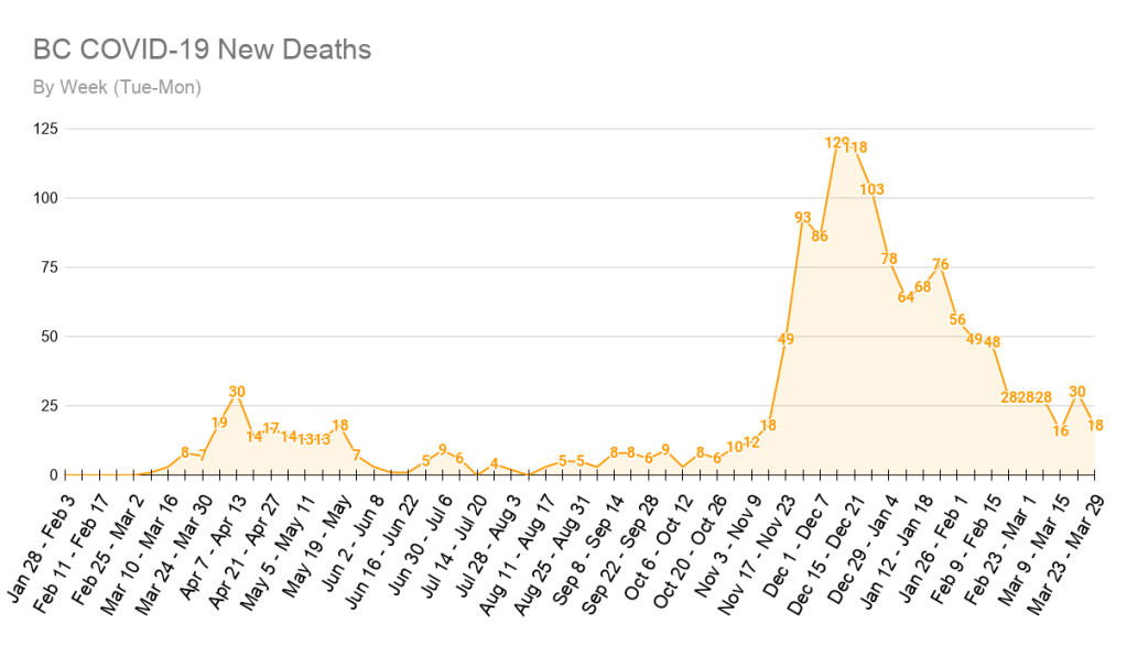 Every Monday we take a look at our week-to-week totals and chart how BC’s fight against COVID-19 is progressing. Because of the reporting schedule used in BC, we use 7-day totals running from Tuesday to Monday. The above chart shows each week of the pandemic as a unique bar.