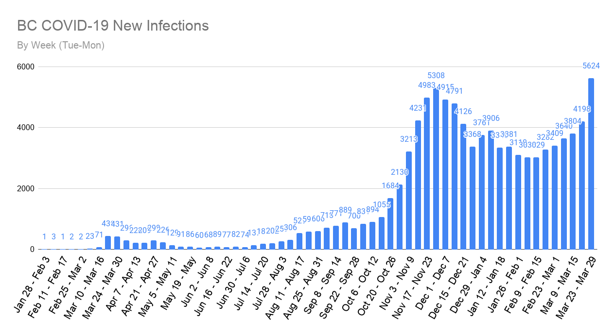 As you can see from the above chart, in the last Tues-Mon 7 day period there has been a major increase in new cases compared to previous weeks. This is now the seventh week in a row we have seen increased cases. This last week also set a new record for the most new cases reported in a 7-day timespan here in BC, since the start of the pandemic. Previously Dr. Bonnie Henry confirmed that we had entered our third wave of COVID-19, and with these numbers there can be little doubt that she is correct.