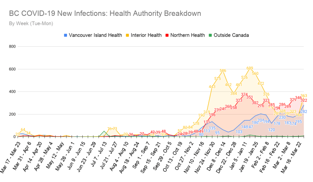 Similar to the Vancouver Coastal Health region, The Interior Health region also saw an increase in new case 7-day totals, by 69%, even after taking into consideration the fact that 36 of their reported cases were historical from 2020 that had been missed. Even the Vancouver Island Health region saw a major increase in new cases.