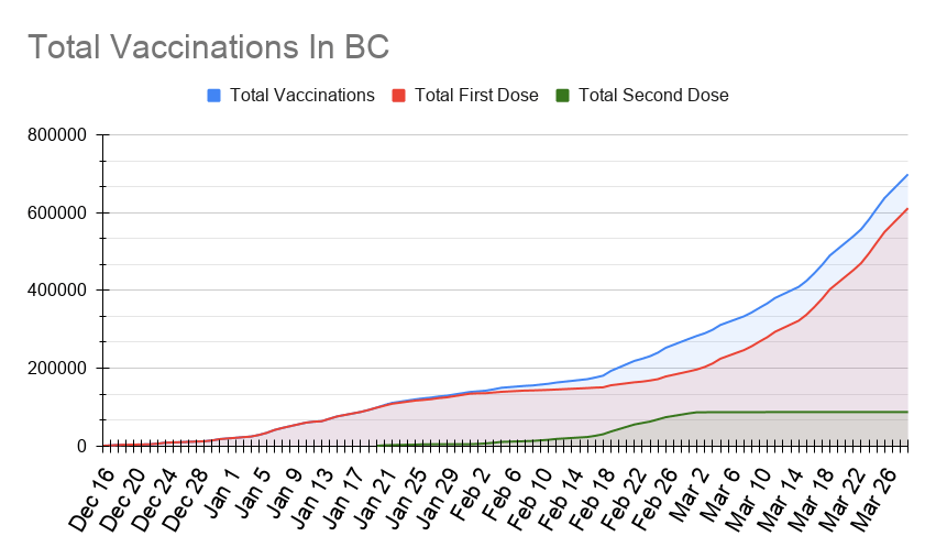 As of today, 611,803 individuals have received at least 1 dose of vaccine, representing about 14.2% of BC’s population old enough to be eligible for the shots. This means roughly 3.7% of the eligible population of BC received their first shot in the last 7 days.
