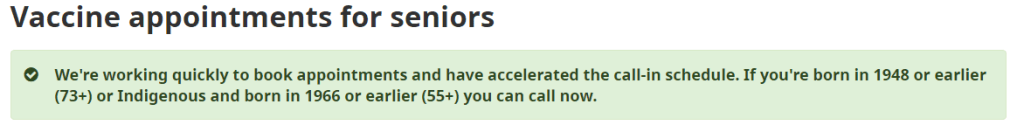 Starting today anyone 73 years old or older may call to book their appointment for a vaccination. The aged based vaccination roll-out has been outperforming its timeline expectations for several weeks now, and it’s getting hard to keep up with all the revisions as they let younger and younger seniors book appointments sooner than expected. Of course nobody is complaining that things are happening sooner than promised.