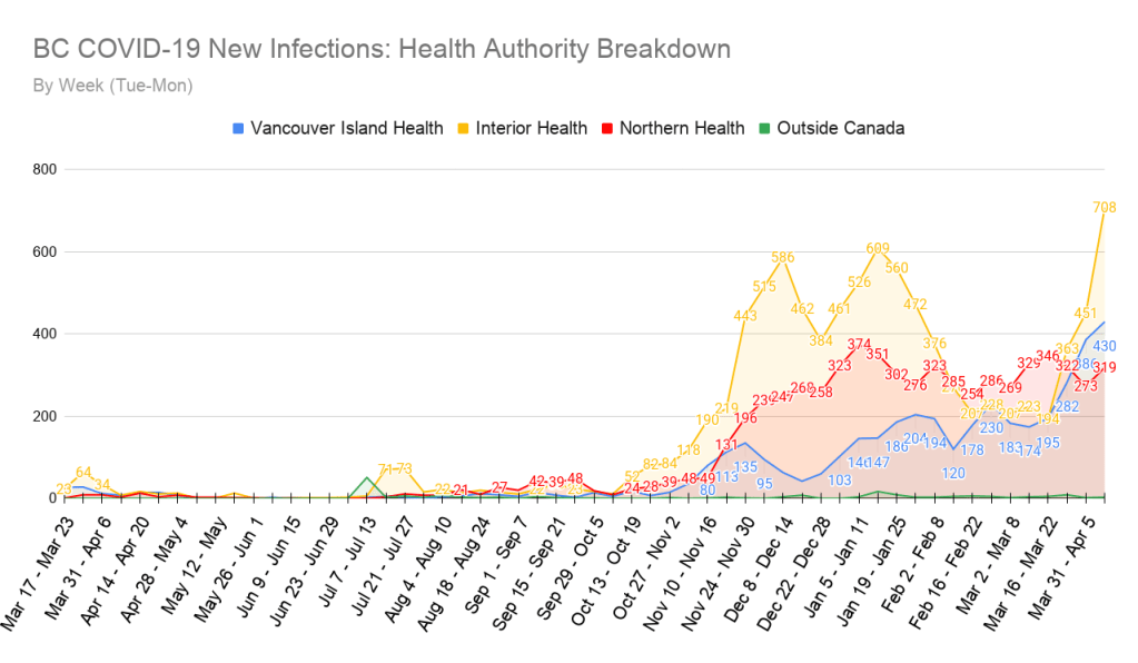 Both the Vancouver Island and Interior Health regions are seeing continued spikes in their new case numbers, especially in the case of the Interior Health region which has nearly doubled its weekly new case numbers in just 14 days.