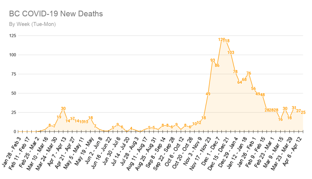 In the last 7 days, another 25 people in BC have died from COVID-19. The numbers have been sitting in the 16-30 range for a few months now, but also appear to be very slowly trending downwards. The good news is that we so far have avoided seeing a third wave of deaths in our province, most likely due to the age based vaccination program that is now protecting all of the highest risk people of BC. The bad news is that we are still seeing far too many deaths every day because of this virus.