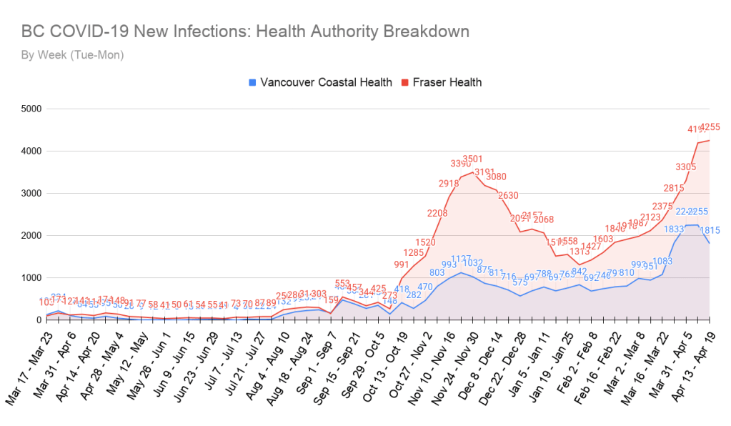 The Vancouver Coastal Health region has seen their weekly new case total drop nearly 20% from the previous week, bringing their current 7-day total to just below the numbers seen during the week of March 23-29!