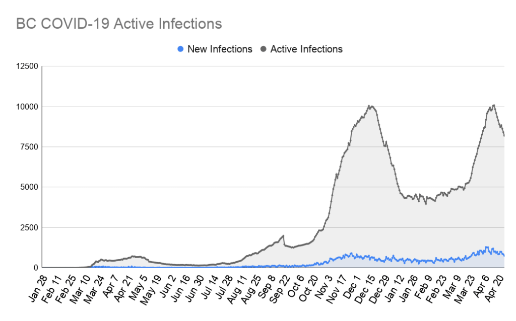 BC’s new case growth rate has been in a steady decline for 4 straight weeks now! Last week saw the growth rate drop to -13.9%, the lowest it’s been since January. If we can keep our growth rate around this point, or bring it even lower, we will be in a very good place come the end of May long weekend.