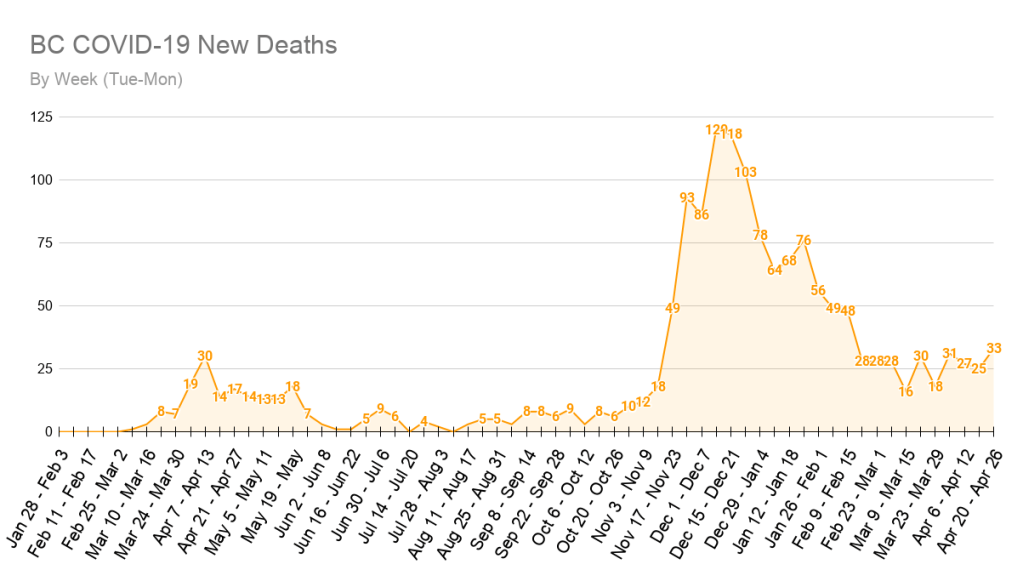 In the last 7 days, another 33 people in BC have died from COVID-19. The numbers have been sitting in the 16-30 range for a few months now, and this week’s numbers are a little above what we have come to expect. It may imply that we are seeing a very slow but steady increase in deaths over the months, or it may just be an aberration in the pattern. Deaths always lag behind hospitalizations, and we’ve been seeing very high hospitalizations for some time now, so this is something we need to keep a close eye on for the time being.