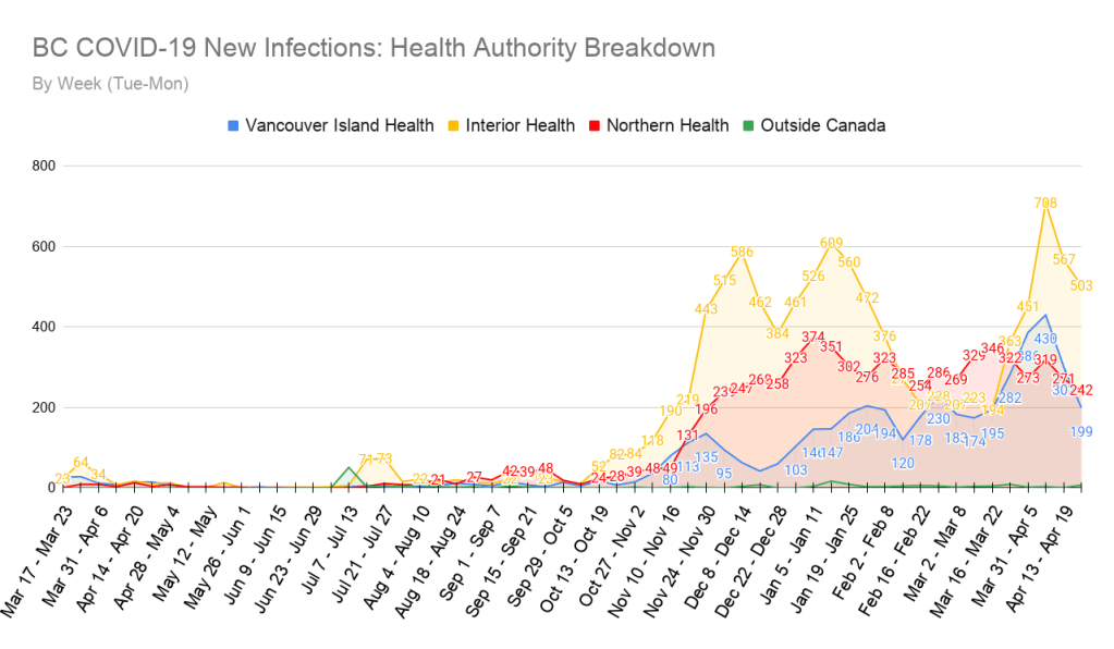 While all 3 health regions shown above are experiencing major drops in new case numbers, it is worth singling out Northern Health specifically as its numbers have not been this low since the first week of December last year! Hopefully this means it has broken out of the back-and-forth fluctuations in numbers it has been seeing these past 5 months!