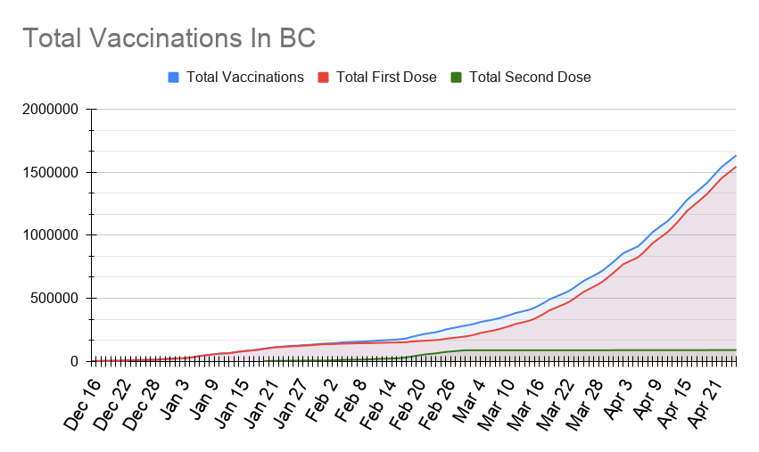 Since the beginning of our vaccination program on December 15th, there have been a combined 1,635,372 COVID-19 vaccinations in our province, with 89,035 of these being a person’s second dose. As you can see from the above graph, second doses have completely flattened out now that the province is waiting 16 weeks between them.