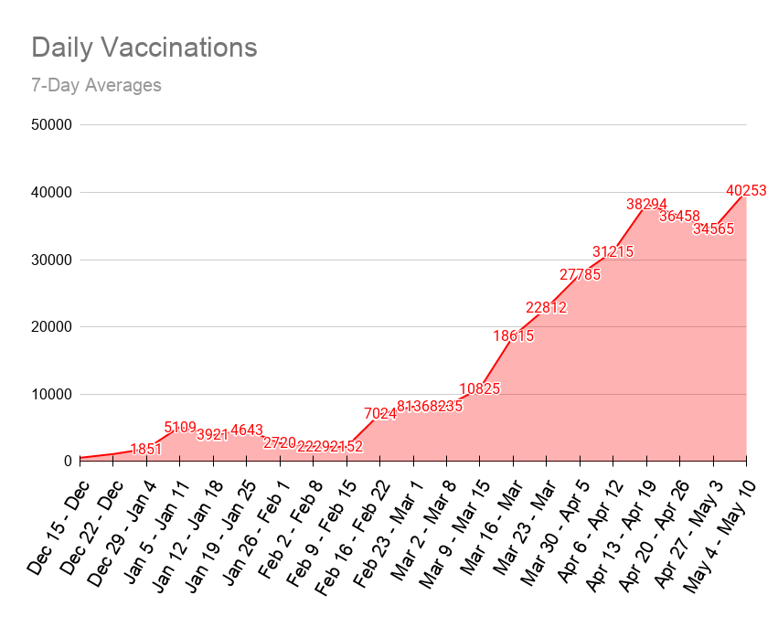 The above chart shows the average number of vaccinations for each 7-day period since the beginning of the vaccination program. As you can see in the last 7 days the daily average number of vaccinations has hit a new record for BC, at 40,253!