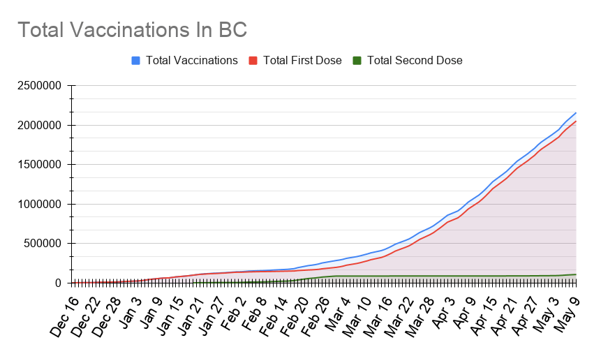 We are still on course for every 18+ person in BC to receive at least one dose of vaccine by July 1st. In fact, based on the numbers above, we will probably hit this goal before June 15th, depending on how many adult accept the vaccine.
