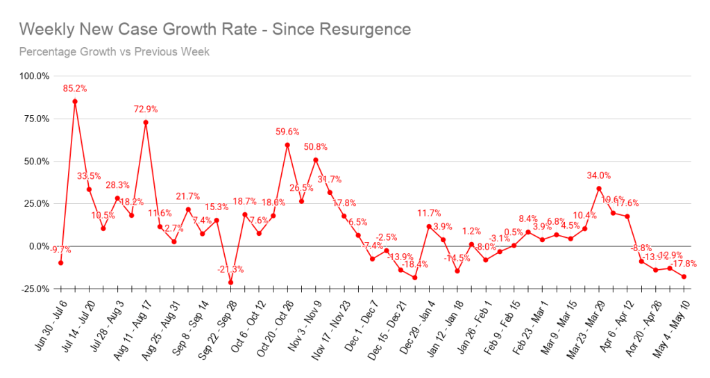 This graph tracks the growth rate between 7-day totals and is a good indicator of the overall momentum of new case numbers.