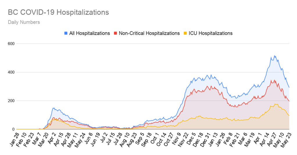 Currently, there are 292 people in BC hospitalized with COVID-19, and 96 of those are confined to the ICU. Non-critical hospitalizations are falling quite quickly now, and the ICU numbers are dropping almost as quickly!