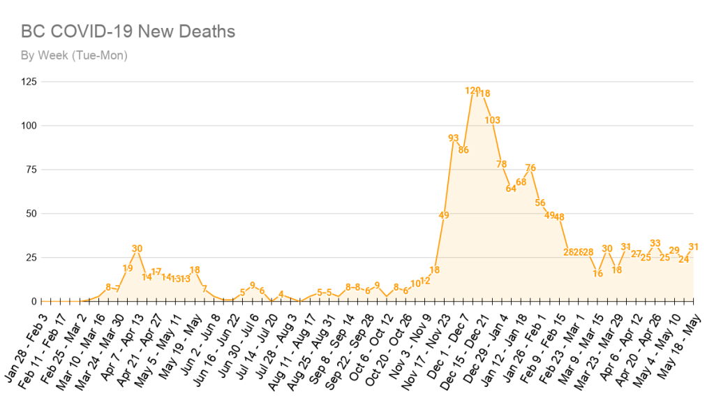 In the last 7 days, another 31 people in BC have died from COVID-19. The numbers have been sitting in the 16-30 (ish) range for a few months now, and this week’s numbers are no exception. Deaths always lag behind hospitalizations, so while this isn’t entirely unexpected, it is starting to feel like it has been dragging on a little longer than one might expect. Hopefully these numbers will see a dramatic decline very soon!