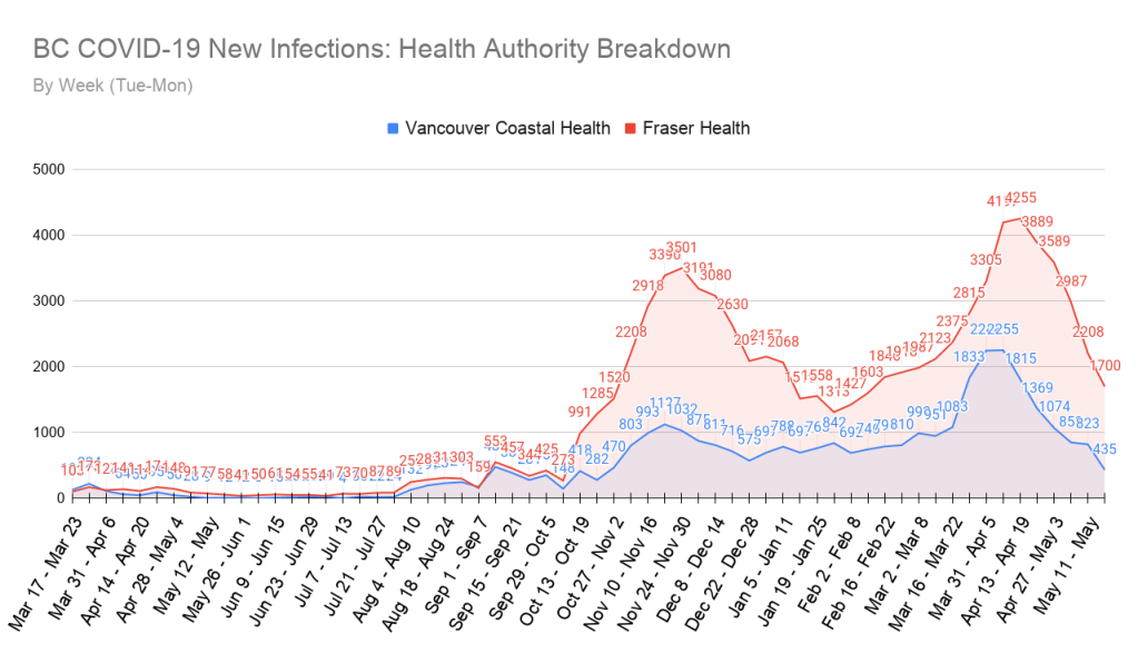 We are continuing to see significant improvements from the Fraser Health region! But while the number of new cases there are dropping quickly, this one region still represents about 63% of all new cases in the province. Vancouver Coastal Health has also seen a major drop in new case numbers.
