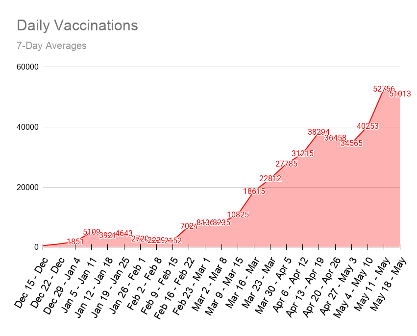 The above chart shows the average number of vaccinations for each 7-day period since the beginning of the vaccination program. As you can see in the last 7 days the daily average number of vaccinations in BC was 51,013. This is down a little bit from the previous week, but well within the same ballpark. We do expect the number to go up again in June though.