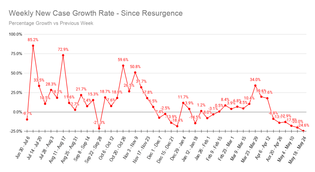 This graph tracks the growth rate between 7-day totals and is a good indicator of the overall momentum of new case numbers.