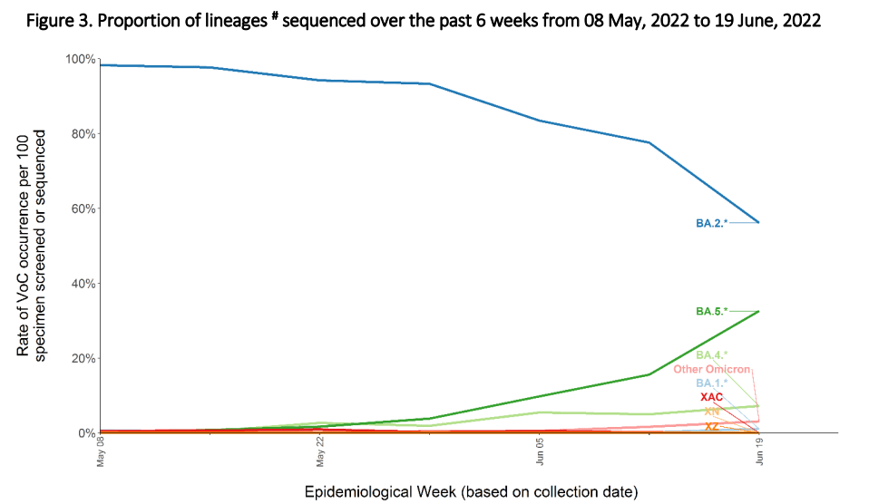 The last 2 wastewater updates have shown us that BC is now headed into a new COVID-19 surge. This also corresponds to BC CDC data showing that the new BA.5 Omicron variant is beginning to replace the previous BA.2 as the dominant strain.