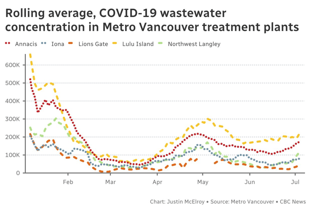 BC has 5 wastewater treatment plants participating in COVID-19 surveillance, which is great as long as you are only looking for data relevant to the immediate lower mainland.