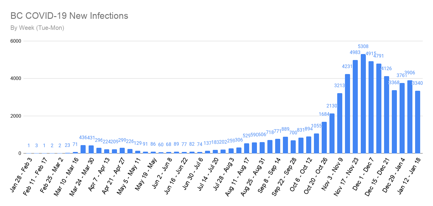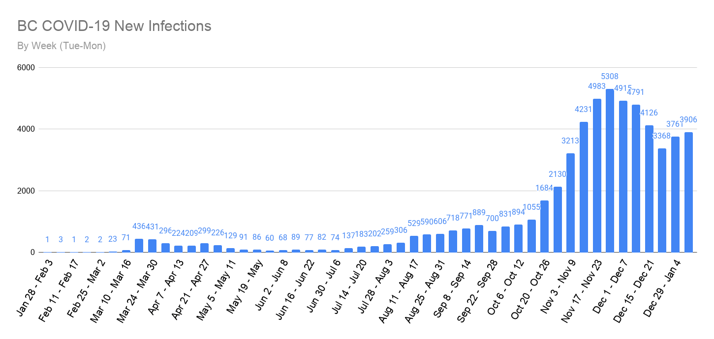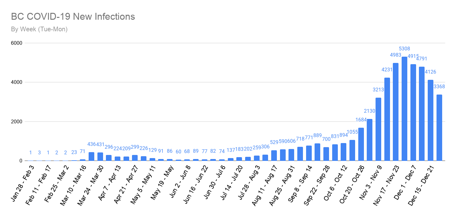 Weekly New Infections Charts Every Monday we take a look at our week to week totals and chart how BC’s fight against COVID-19 is progressing. Because of the reporting schedule used in BC, we use 7-day totals running from Tuesday to Monday. The above chart shows each week of the pandemic as a unique bar.Continue reading “COVID-19 Diary – Day 325”